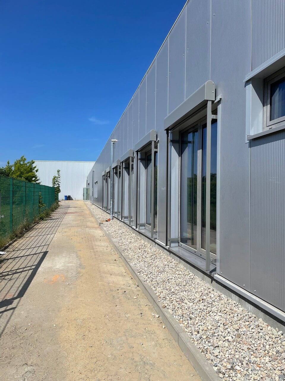 Die Arbeiten an der Gebäudehülle konnten erfolgreich abgeschlossen werden. Die Fassade präsentiert sich nun in einem modernen und zugleich funktionalen Materialmix: Zum Einsatz kamen mikrolinierte Sandwichwandelemente in der Farbgebung RAL 9006, die durch ihre silbermetallische Oberfläche einen zeitgemäßen und hochwertigen Eindruck vermitteln. Ergänzt wird das Erscheinungsbild durch schwarze Faserzementplatten, die einen eleganten Kontrast schaffen und dem Baukörper architektonische Tiefe verleihen.