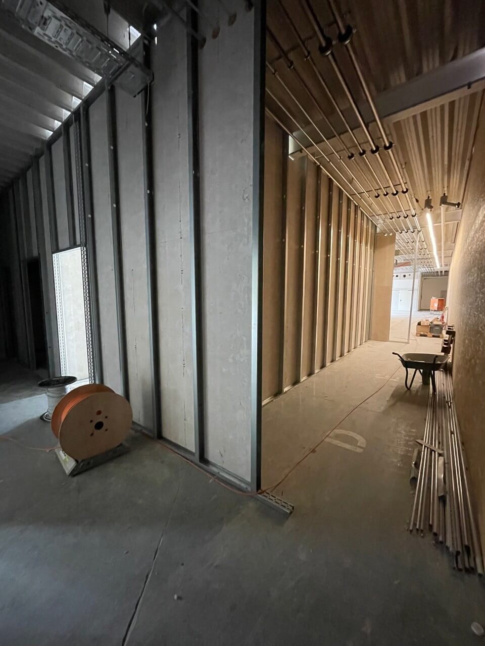 Im Inneren des Gebäudes wird derweil mit Hochdruck an der Fertigstellung der Trockenbauarbeiten gearbeitet. Hier entstehen derzeit die Raumstrukturen, die später die Grundlage für die endgültige Nutzung bilden werden. Mit jedem Baufortschritt nimmt das Projekt weiter Gestalt an und nähert sich Schritt für Schritt seiner geplanten Fertigstellung.