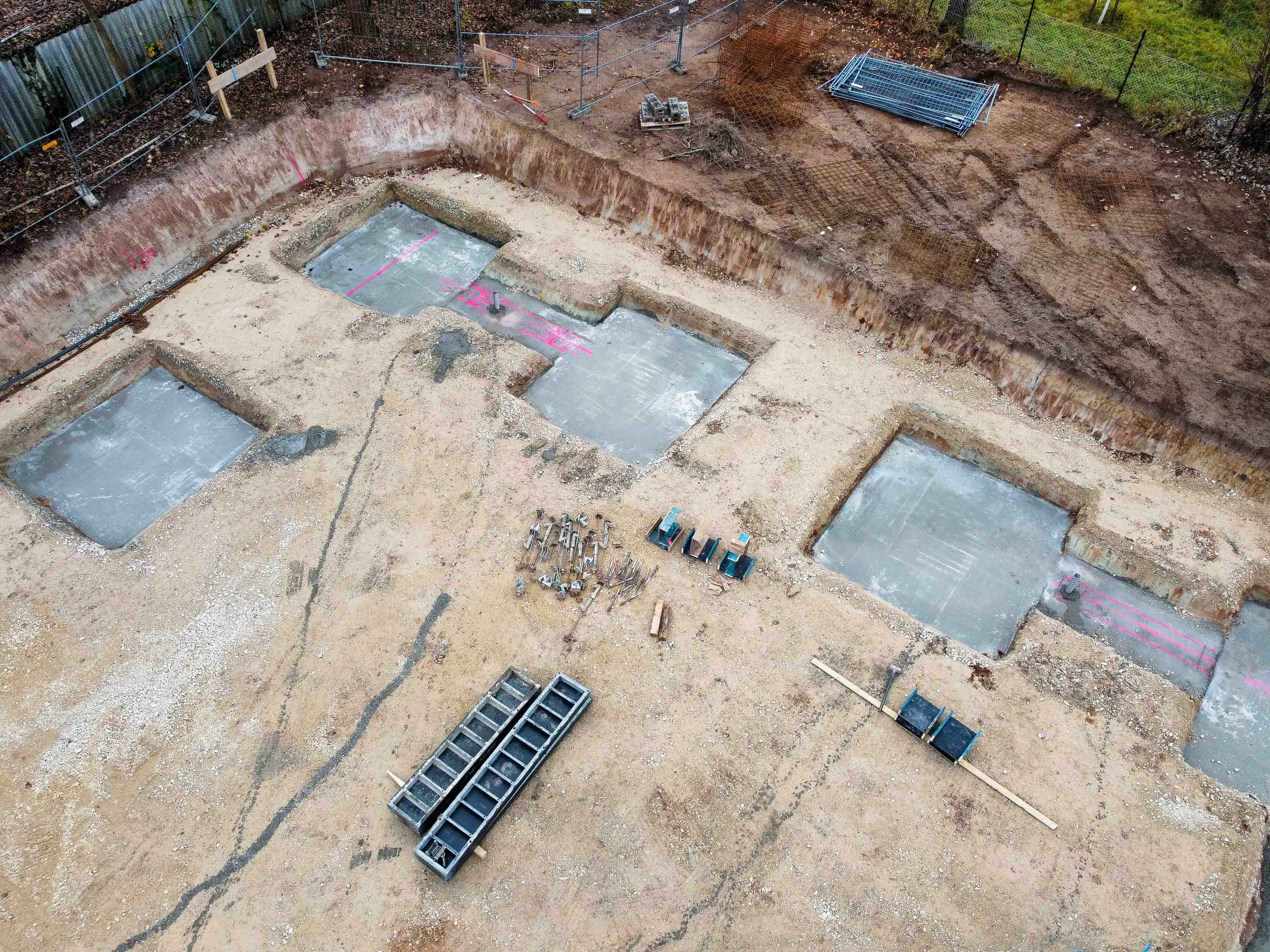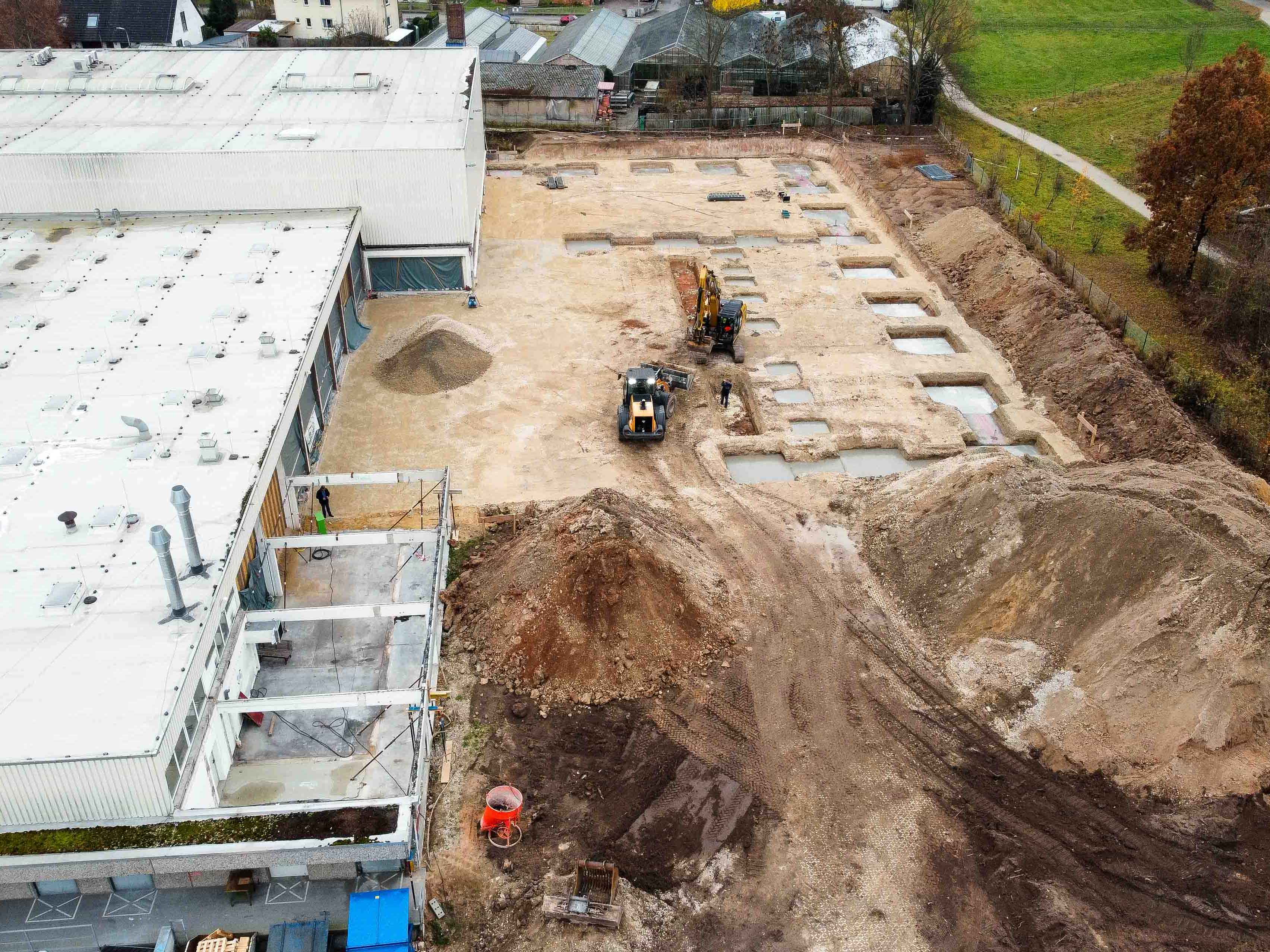Um weitere Anbauoptionen frühzeitig zu berücksichtigen, wurden Regenwasserstaukanäle angelegt. Die Einrichtung einer zweiten Feuerwehrzufahrt in Abstimmung mit der Gemeinde stellte eine koordinativ aufwändige Maßnahme dar, die erfolgreich umgesetzt wurde. Das komplexe Projekt umfasste eine robuste Stahlbetonkonstruktion, den Teilabbruch bestehender Bauten sowie herausfordernde Gründungsmaßnahmen aufgrund von Grundwasserproblemen. Zudem wurde eine große PV-Anlage (> 100 kW) durch die beEnergy Group installiert, um eine nachhaltige Energieversorgung sicherzustellen.